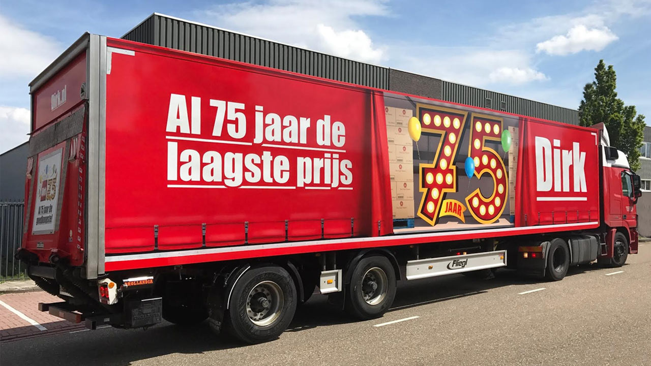 Dirk van den Broek heeft een uitgebreid wagenpark. Voor een tiental vrachtwagens met opleggers maakte ik een design en werkte ik dit ook uit. Het is altijd weer een gave uitdaging om op groot formaat flexibel met fotomateriaal om te gaan. Leuk om te vertellen: de spanbanden heb ik van een echte vrachtwagen gefotografeerd. En het openslaande doek is een klein plastic zeil dat ik kocht bij een bouwmarkt. Het interieur creëerde ik met behulp van een 3D programma om het ‘inkijk’ effect zo realistisch mogelijk te maken.